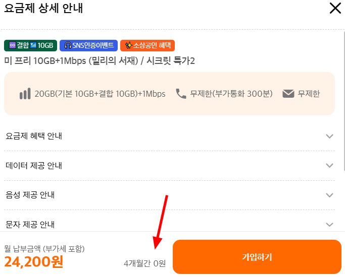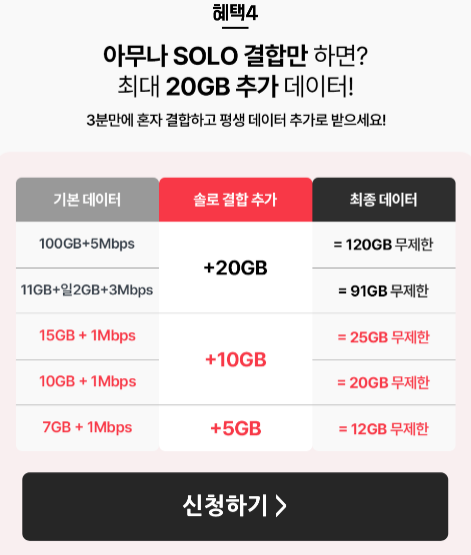 - 데이터: 월 20GB(기본 10GB + 결합 10GB) 제공, 소진 시 1Mbps 속도로 무제한 이용 가능