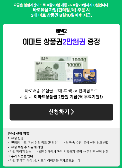 여기에 더해서 바로유심을 구입해 사용할 경우 2만원 상품권을 제공합니다.