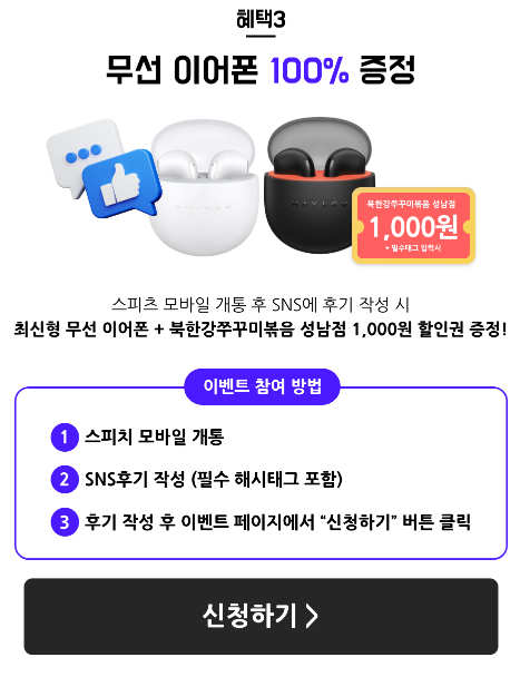 그리고 sns인증을 하면 무선이어폰까지 받을 수 있는 혜자 상품이 스피츠모바일에서 나왔으니 이건 참여 안 하면 바보가 될 것 같습니다.